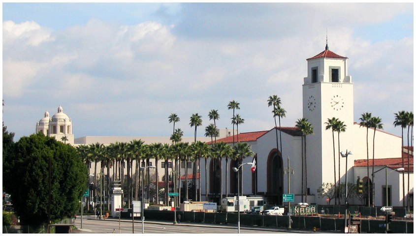 这是洛杉矶联合客运枢纽站,建于1939年,是美国最后修建的一个大型火车站。它坐落于洛杉矶唐人街的旧址。如今,联合车站服务于火车、地铁、公共汽车等各交通工具。车站建筑融合了西班牙、摩尔和流线型现代风格,经常被作为电影的拍摄背景。